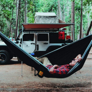 This portable, heavy-duty hammock makes it easy to relax comfortably by the fire or sleep under the stars.
