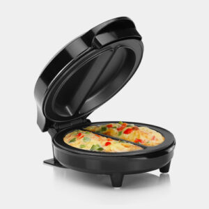 Makes two fluffy omelettes in minutes without flipping mishaps. Non-stick cooking surface makes it easy to clean.