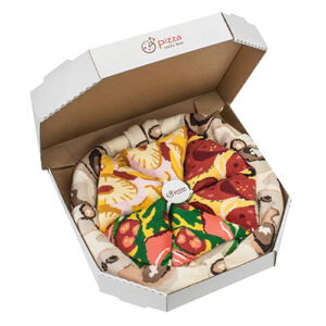 The perfect gift for pizza lovers anywhere! This hilarious pizza box with 4 pairs of pizza socks will bring tons of fun and laughter.