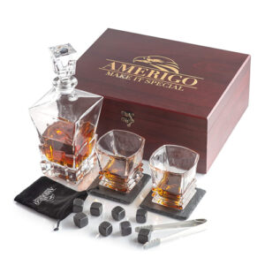 This elegant whiskey set that includes a decanter, glasses, coasters, and chilling rocks will make a stylish addition to his barware.